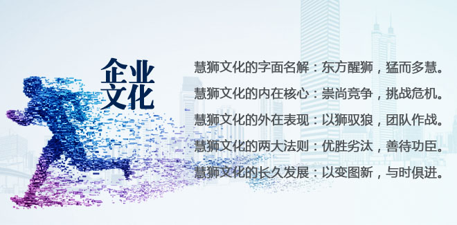 我司的企業(yè)文化為“慧獅文化”,是集東西方企業(yè)文化的優(yōu)點,結(jié)合本企業(yè)的特點,順應(yīng)客觀需要的企業(yè)文化。她經(jīng)歷了多年的實踐和完善,逐步磨練成熟,已然被全體員工認(rèn)可、奉行、并在企業(yè)的經(jīng)營管理活動中發(fā)揮著難以估量的作用,是我們企業(yè)一筆豐富的無形資產(chǎn)。